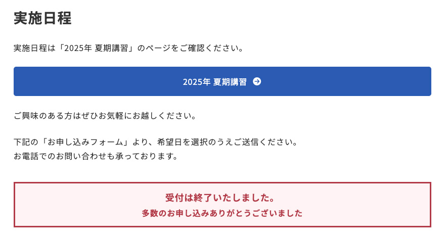 締め切り日が過ぎると、これまで表示されていた無料体験申し込みの枠が非表示になり、「受付終了」のアラートに切り替わります。