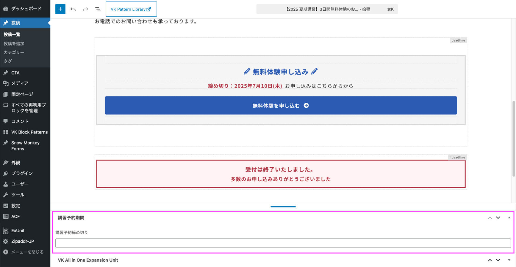 「講習・特別授業」カテゴリーの投稿記事の編集画面の下部には「講習予約期間」>「講習予約締め切り」が表示されています。