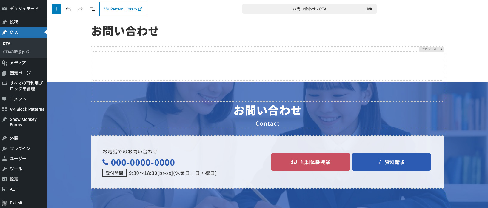 フッター上にある「お問い合わせ」部分は、ExUnit(VK All in One Expansion Unit)プラグインのCTAの機能で表示しています。編集する場合は、編集画面の「CTA」の項目をクリックして、該当の「CTA」の記事を「編集」してください。