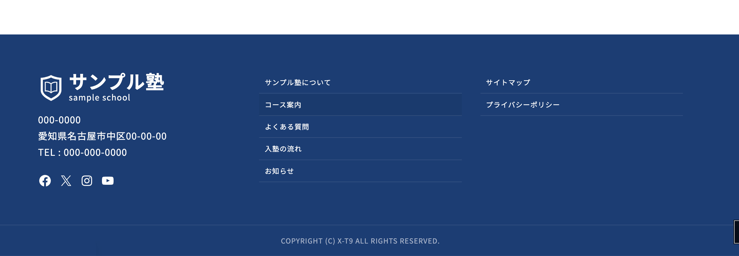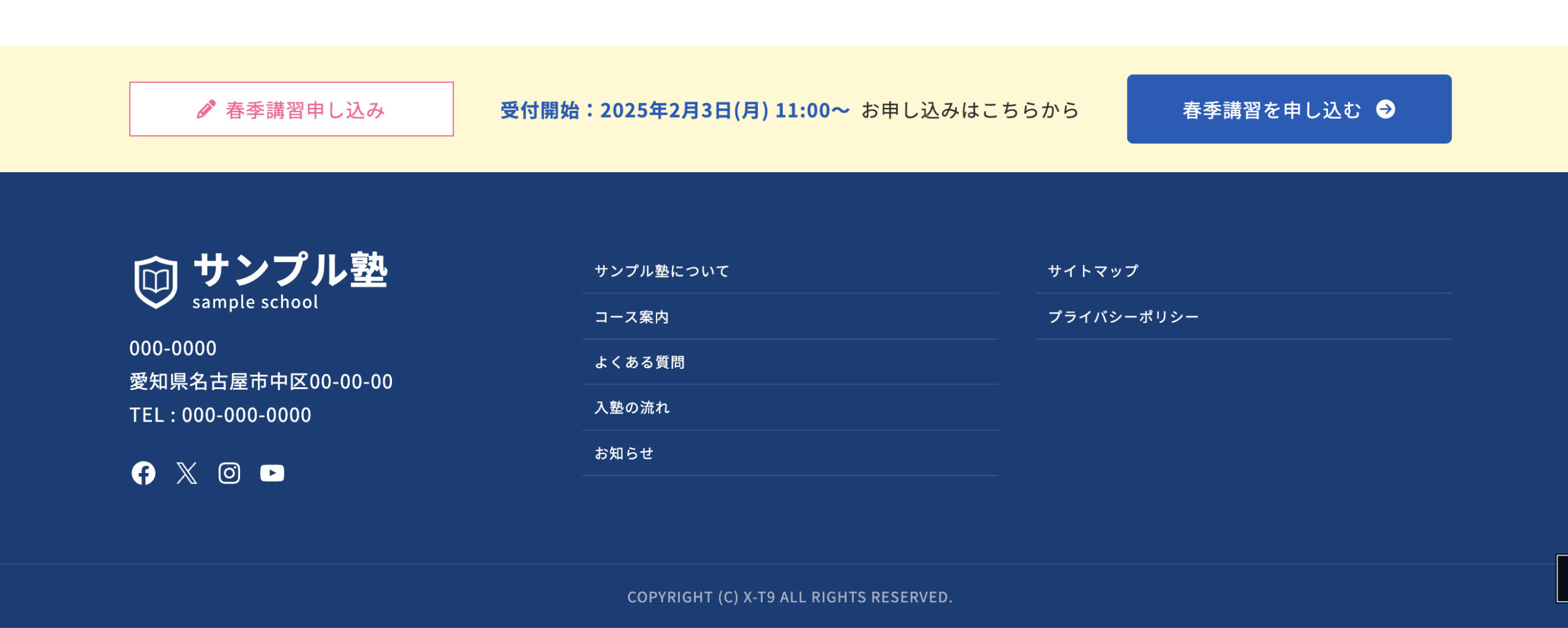このサイトは、WordPress公式テーマ X-T9 と、拡張プラグイン VK Blocks Pro をベースに構築した、学習塾向けのデモサイトです。