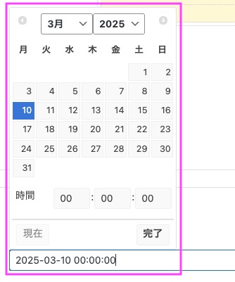 例えば、締め切りが2025年3月10日0時までとして、日付と時間を入力してみます。