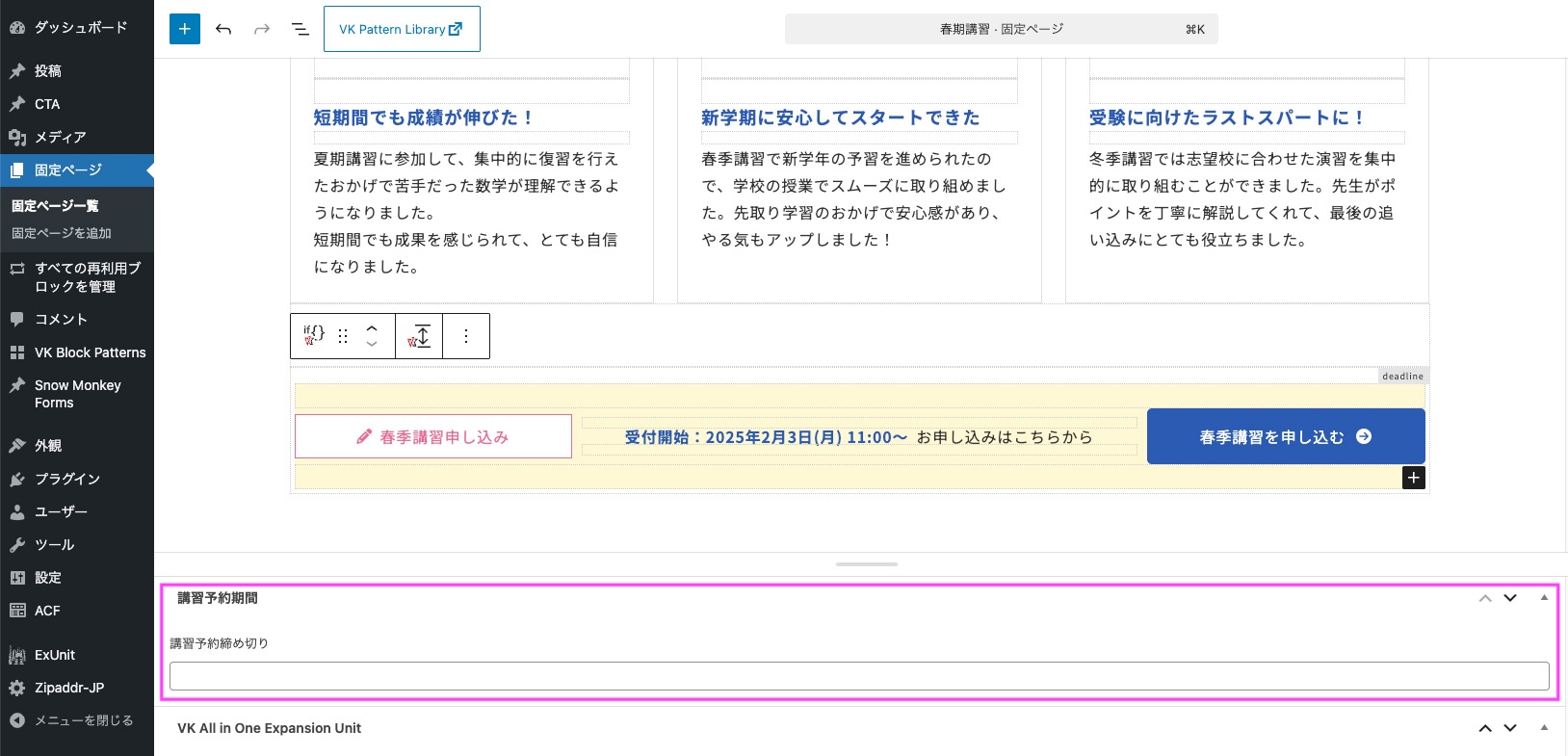 固定ページの季節講習「春季講習」「夏期講習」「冬季講習」ページの編集画面の下部には「講習予約期間」>「講習予約締め切り」が表示されています。
