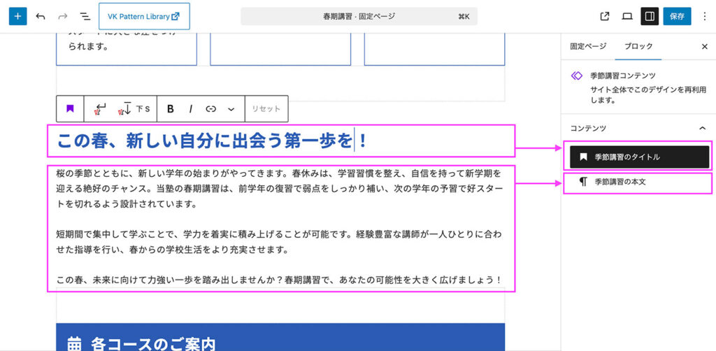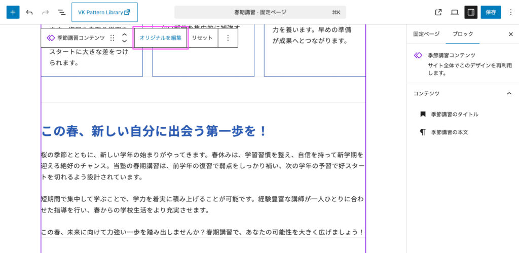 例えば「春季講習」ページの編集画面を開くと「季節講習コンテンツ」の箇所は同期パターンのため、一部のテキストだけ変更が可能になっています。