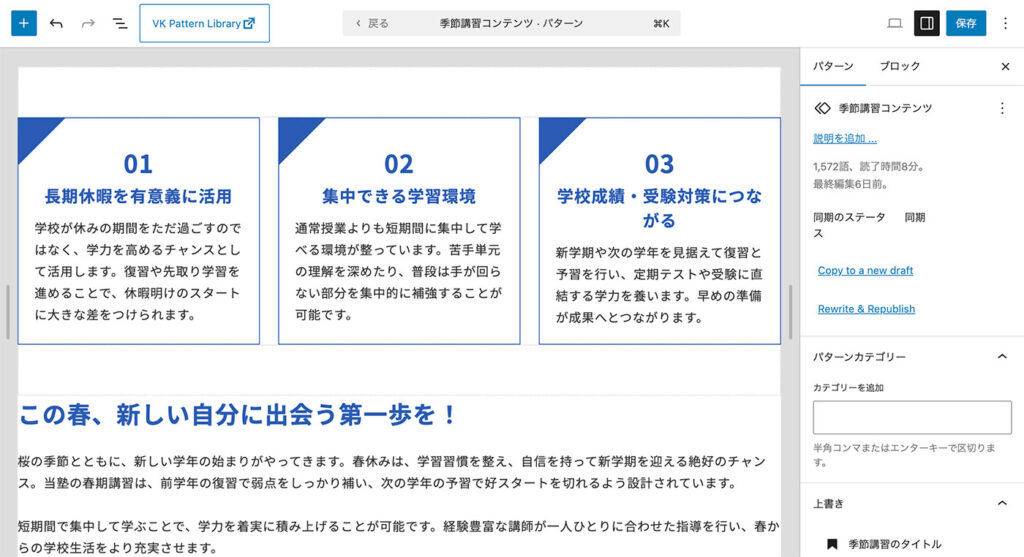 このパターンを編集する場合は、編集画面の「VK Block Patterns」> 「VK Block Patterns」の該当の記事を編集してください。
